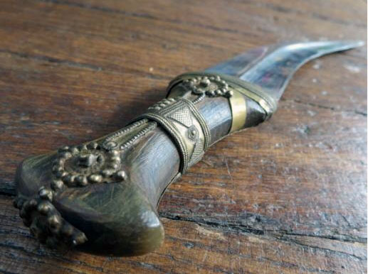 After a closer inspection I have come to two possible conclusions about this knife. First, it is a different beast. The hilt is noticeably smaller than that of any other Jambiya I have seen. The second thing that strike me, and something you notice as soon as you pick it up, is its weight. It weighs almost nothing, and yet it is all business. This is no toy. I think this may have been intentional and is the reason the hilt does not have the metal band typically found around the base of the hilt. I think weight may also have been the driving force behind the embossed brass sheath cover. It is durable and light. The blade is forged and good steel. Too good for the owner to have been a cheapskate. I think this is one of two things: - a knife meant for a child - what I call a "keeper". Items get heavy after a while. People throw away things they would never have dreamed they would toss once they realize their survival may depend on lightening their load. Not the one though. It weighs almost nothing. Thanks much for the help. I hope someone can translate the Arabic. Harry |