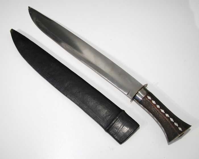 Vendor Description: Nepalese traditional knife, not a piece for tourists, very sharp quality blade, wooden sheath with fine artisan engravings LOA: 30 blade:22cm. |
