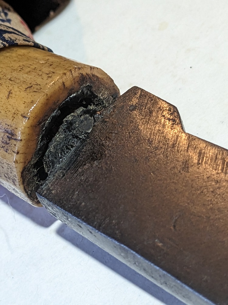 given the evidence I would like to agree. I have seen many new ones in YouTube videos and online, out of all the ones I have seen on the market, with my limited knowledge, I would trust this one to be most likely genuine old and quality. seems it was overlooked, undervalued and rejected,(first time sold no bids, second time around I had money perfect as objects like that seem to be meant for me and usually I have great luck with them.I actually don't see any other one , that I would rather have than this one. good look to the carving, very happy with it, its got a certain presence to it. it is quite heavy, definitely a chopper. I would think this one was a user , not made for show, looks it has been well put to the test and earned some working life repairs. I would hope it was made with the native metals, but found some curious partial marks on the blade? the blade seems to have all the right angles to have been made the old way. I am hesitant to clean it... any tips to identify human bone? Kalimantan or? age? clay tempered? thanks for looking , sorry if too many photos but I like to see all the angles and i think many would agree Last edited by JoeCanada42; 21st February 2023 at 03:32 AM. |