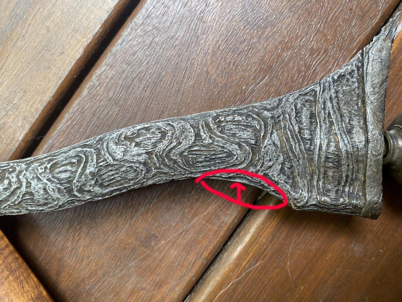 Blade is slender and dainty and looks to me like the Javanese pamor lawe saukel; overall seems like a Javanese product. Blade is old, but has been well-fitted to the Malay-type sheath.