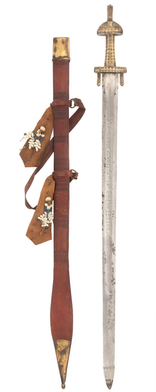 With straight blade inscribed in loose naskh script with the Profession of Faith and the name of the Sudanese leader Muhammad al-Mahdi (La Illah allah Muhammad Rasul All Nasr min allah wa Fath Qarib Muhammad al-Mahdi Khalifa Rasul Allah "There is no god but Allah, Muhammad is his Prophet, help from Allah and present Victory"), one side engraved with a lion within a roundel and pseudo-calligraphic medallions, the hilt with an engraved lattice of quatrefoils, the leather sheath with cowry tassels