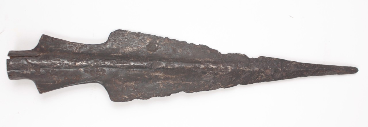 I have three winged spears from the Axt collection. This one is 12.5" and clearly a river find (it is heavily encrusted with the iron compound characteristic of such things whose name escapes me). The poor thing has a severely notched blade. Frankish 8th c(?).