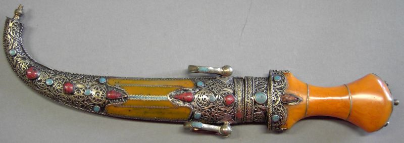 THESE LAST TWO DAGGERS ARE LIKE THE MAJORITY OF THE DAGGERS MANY SHOPS IN MOROCCO WERE FULL OF. THEY ARE FLASHY BUT NOT AS OLD OR AS GOOD WORKMANSHIP AS THE FIRST TWO. THE AMBER WILL BE REAL LOW GRADE AMBER MELTED AND REFORMED AT BEST, BUT MORE LIKELY SOME MORE MODERN SORT OF POLYMER RESIN. THEY DO MAKE A GOOD DISPLAY AND THE SOUKS IN MOROCCO WERE QUITE ATTRACTIVE WITH LOTS OF THESE AND MANY NICE RUGS MAKING UP THE WALLS AND FILLING THE SHELVES AND DISPLAY CASES.