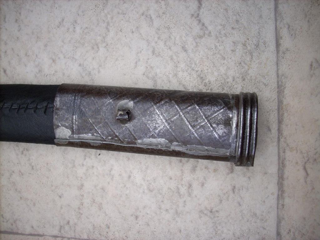 Its a pleasure, Yes you are perfectly correct. I had not noticed this before your query so I checked. The throat piece is a slightly loose due to shrinking leather and wood so I slipped it partly off the scabbard to look and feel inside which was perfectly smooth and free of any impressions in the metal. Well spotted. Is it appropriate to ask why you wanted this info?