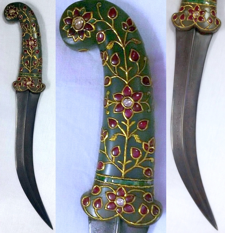 I know there are exceptional craftsmen in India that can produce exceptional work. Just didn't find myself, any. And didn't see any nicely chiseled blades coming out of their recent production either. However, I keep looking! As with regards to the "Mughal" Khanjar in your photos... I guess it's an antique Persian wootz blade with a new Indian Mughal style hilt. |