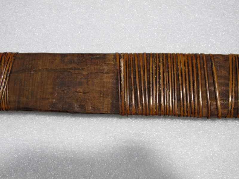 Here are the scabbard close-ups. It seems the two pieces of wood are held together by this cane or rattan wrapping, but is this kind of scabbard usually wrapped all the way, or just in deliberately spaced bands? Is the cane the only thing holding the two slats together, or is there ever some kind of chappe, nail, or peg?