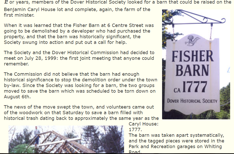 On April 19, 1775, 66 Dover Minutemen marched to fight along Battle Road under the command of Captain Ebenezer Battelle. Elias Haven had been at work harrowing a field on the Chickering farm (still operating at 56 Haven Street) that morning. According to tradition he left his harrow in the field to answer the call to arms, and "was [later] shot down while standing beside his brother-in-law, Aaron Whiting, at a corner of the Arlington meeting-house and is buried near the spot." He was the only Dedham man killed that day. The harrow he abandoned is now in the Fisher Barn. |