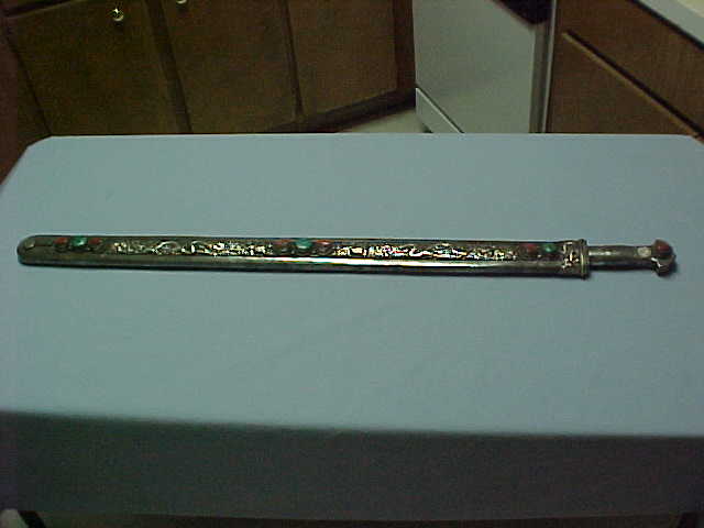 This next example is a composite piece. It was probably assembled around the 40's or 50's utilizing really nice older, probably 19th century, silver panels with a steel scabbard and handle that does not follow historical styles, i.e., this grip is cylindrical where historically they tend to be rectangular.