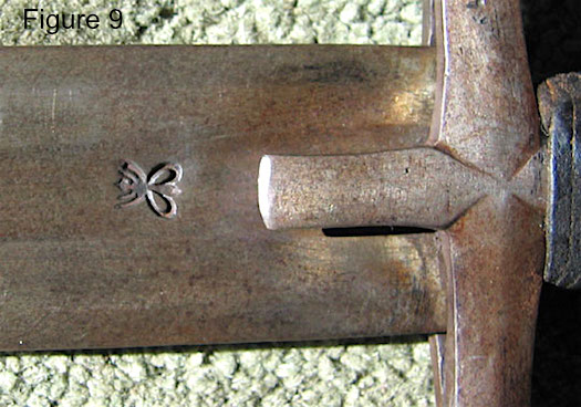 An example is shown in Figure 8. Dukkeri. This may be Brigg's dukeri for crescent moon with man's face in profile. A Kassala informant said it meant “for men”. Swordsmiths there describe a sword called a duk'ri (my transliteration) and is decorated with an Orb & Cross and a Rampant Cat/Lion. Dubbana or Duban. Fly. Likely signifies the biting fly that appears with the rains and is very harmful to camels. It's arrival prompts camel herding pastorialists to take their animals north out of its range. Dubban also means “thousands” in Hausa, maybe signifying the number of flies that swarm about. It also may indicate Hausa smiths possible role in applying this fuller type to Sudanese blades. The informant said it encourages “jumping like a fly when fighting.” (See fly symbol on Jeff D's sword, Figure 9. His sword also has a lion and orb & cross on it.) Nugara means “drumming”. Informants used daluka for drum and (perhaps hearing the drum beat) say that it “builds courage”. The drum symbol they presented was the famous Orb & Cross. Among most northern Sudanese ethnicities the large copper kettle drum is central to their culture. According to Clark, p.13, it may only be beaten in mourning of a death in the chief's family, to summon the tribe to war, and at a festive occasion for the tribe. The tribal drum also is used in Darfur, of the Medieval Funj Kingdom, and may be universal in Northern Sudanese culture. The Funj Kingdom (1504–1821) had its capital at Senner on the Blue Nile River. Its lands were mainly on the east side of the White Nile north into the Gezira and included the Butana Plain. Arkell (1932) reports that the Funj had a brand put on their beasts and slaves called Noggara wa Asiaiya. This means “drum and stick” and the symbol is O+, rotated 90 degrees clockwise (in other words, resembling the symbol used by biologists to denote “female”). This symbol looks the same as Peter Kull's Cross & Orb. It is conceivable that the Kull sword mark culturally replaced the Funj symbolism that had been abolished by the Egyptian conquest of the Funj, and it became highly valued on the kaskara blades. One culture often borrows from another. If a cultural feature persists for generations it has continued relevance. If not, it no longer has meaning. Steven Wood's sword has a properly oriented Funj “Drum & Stick” mark (Figure 10). Asad means “lion”. The informant said it is for “brave men”. A full-bodied lion is often lightly engraved, maybe etched, on native blades, but the Rampant Lion/Cat in #73 above is sometimes seen. The informant said that the lion is placed on the front of the blade and the drum and fly placed on the back. In a 2010 post, Steven Wood commented on the orb, the lion and the fly and, based on references to Burckhardt and Cabot-Briggs, concluded that dukare affring means “frankish mark”. My field notes written under a sketch of the same three symbols records the local understanding of the terms: dukare = “for men”, al fringe = sharp, and then the note that the swords were “made in Europe – brought to Ethiopia by Italian soldiers”. Thus, the interpretation may be drawn that when Italian troops occupied Kassala (1894–97) during the Mahdiya, they presented some German made blades with the Kull marks and moon faces saying in Italian “these are German marks.” The local bladesmiths understood the blades are “for men” and are “sharp”. This scenario would indicate that this type of Solingen blades were introduced to the Kassala sword-making community about 1895. They then became part of the culture of sword making there and expanded broadly. My notes may be a thin reed on which to hang this narrative, but it does have the elements of a factual encounter. The Italian military also did occupy Kassala in 1940 for six months, but that situation doesn't really support the delivery of German sword blades to local blacksmiths, and 1940 post-dates Clark's 1938 report. Plate LII of Reed has what is likely an original European blade prototype of this type. It is marked with an early version of the Orb & Cross and a Passau works running wolf. (Reed reports that the sword's owner thought the symbol was a tree.) Note that the end of the fuller appears circular and not sloped to the blade surface as are the examples shown by Katana and Chris. Reed dates it “between the sixteenth and early seventeenth centuries.” The sword's owner says it's before the time of Kassala exports. My research in Kassala confirms that Sudan-wide export of Kassala made swords dates from 1960. There are many examples of this type in collections, including the Royal Armouries collection (Cat. Nos. XXIVS 165 and 166) and others. Several posts on the EAA Forum have exhibited swords with the three symbols apparently originally struck by Solingen makers as well as those etched on locally made swords. Katana/David's W. Clauberg marked (Standing Knight) Dukkeri is datable. Bezdek's German makers' marks book shows that the Standing Knight was used after 1847. David's sword is shown in Figure 11a, and the Standing Knight example in Figure 11b. Mefidk/Chris blade with the crocodile skin grip has a W. Claberg Standing Knight (hidden) and the “enigmatic” mark (shown) (Figure 12). Steven Wood has a single fuller sword with a Lion mark on a single groove blade (Figure 13). It looks more European than native-made and does not resemble the Kull mark to me. The Metropolitan Museum of Art has a kaskara (Cat. No. 1977.162.4) with a Dukkeri fuller. It is classified as late 19th C Sudanese with a late 15th–16th C Italian or South German blade. They show a Passaua wolf and a maker's mark of a seven-pointed star. If the attribution is accurate, this blade would date the fuller from a century earlier than Reed's LII. Unfortunately, the MMA web site does not have a photo of this sword. However, it can be viewed via an illustration in an article available through JSTOR: Autho