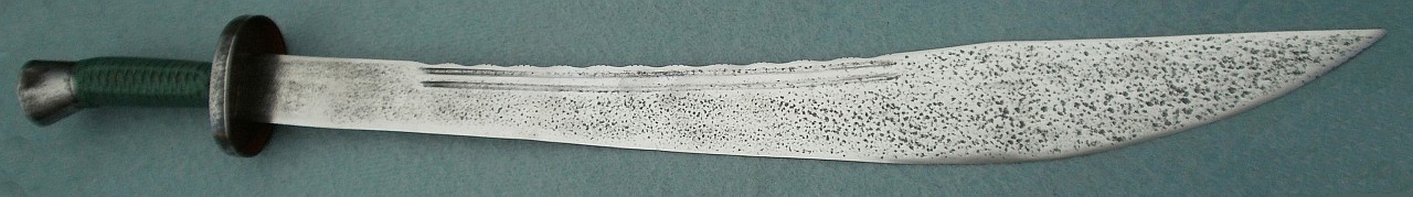 Nice piece! Yours is a standard pattern Qing military officer's saber of the mid 19th century, probably of northern origin, possibly Beijing. The greenish grip wrap was once a deep indigo blue. While they superficially all tend to look the same, these come in a rather wide variety of qualities. I'd say your blade is among the better ones, with very precisely cut grooves. The work on the mounts is more standard quality for this type. Officers got fixed payments in silver to purchase their equipment, and so focussed on what they found important. In your case, he put extra care in the blade. These Islamic style grooves probably made their way into China already during times of Mongol rule and were produced throughout the empire by the 18th century. See: https://www.metmuseum.org/pubs/journ...f.bannered.pdf I've had several over the years. The pictures posted above by Kronckew are from my site. Here's the full article: http://mandarinmansion.com/chinese-officer-saber Another one, with rare blade: http://mandarinmansion.com/chinese-s...se-tooth-blade An exceptional one: http://mandarinmansion.com/rare-chin...ist-core-saber And finally, an example of the plain type that the regular soldiers would be carrying: http://mandarinmansion.com/19th-cent...military-saber As for restoring, I'm not sure where you are located but if I were you I'd send it over to Philip Tom for a good fix. I hope this helps! |