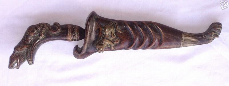 I received this Kujang, your comments are welcome. The handle is carved in the shape of a tiger, the scabbard is decorated with a tiger's head and a paw as tip. The blade shows a nice pamor pattern. dimensions: total 45.5cm; without scabbard 36.5cm; blade 22.5cm I have some questions about it: - How old could it be? I think it is not very old, but I'm not sure. - Was this weapon only used by the Sundanese people? - My Kujang blade has 7 holes. In this thread I can read that this refers to the seventh month of pregnancy: http://www.vikingsword.com/vb/showth...ghlight=kujang Is this right or are there other possible interpretations? pictures: |