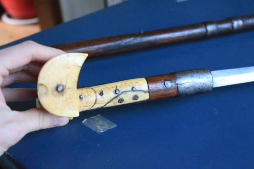 I just got this off of ebay earlier this week by the way, so the pics I'm sharing are just from the seller, but according to USPS it should be here tomorrow! Fingers crossed a truck doesn't accidentally sit on it or something lol. Anyways, what I have here is clearly a sword stick with handle scales transposed onto it from an archetypical, large-eared yataghan! To me the most logical story here is that it's some kind of bring back/trophy, either from actual combat or (I suppose more likely) from some kind of exploitative tourism or colonialism. This then to me seems like it would be a rather cool heirloom piece - the valuable, identifiable handle scales passed on to a style of sword more owner-friendly, long after the blade was deemed obsolete. Or, perhaps less romantically, stripped soullessly from the original piece, put on a more "refined" and "eloquent" style of weapon. Either way, a very cool juxtaposition of cultures and martial traditions. One further origin that's possible is that the whole piece is natively made; perhaps the native turkish owner of the original yataghan wanted this sword stick to be fashioned for it, keeping the scales, and reformatting it as a more western, then-socially acceptable style of sword, allowing them to be able to carry their ancestry about in public without scrutiny. Either way, somehow it got to Ohio, and will soon be in Minnesota lol. I have yet to memorize the attributions for different yataghan styles, but I believe ears of this kind were just found on straight turkish-made examples right? Not greek or balkan? Also are the handle scales a discernible kind of ivory? I know walrus was quite auspicious but idk if elephant is the more likely material. Also also I'm no expert on sword sticks, so if this one belongs to any identifiable style please let me know that too. That's actually part of the reason why I'm sharing it here, as the whole item is rather out of my area of expertise. To be honest, part of the reason why I bought it in the first place was just because I liked the contrast between the wood, ivory, and metal fittings. I've always wanted a large-eared yataghan, but as a college student I've never had the money saved up for one, so this is a welcome alternative. Finally, speaking on the materials, I'll post more close up pics of everything once I get it, but I'd be interested in conserving pretty much every aspect of this sword, so if someone could give me advice here or in private it would be much appreciated. There are some gaps/cracks in the wood and also quite clearly some kind of epoxy was used to fill several chips between one of the handle scales and the rest of the grip, so any advice on how I could remove that and at least replace it with a slightly less blatant repair would be similarly appreciated. |