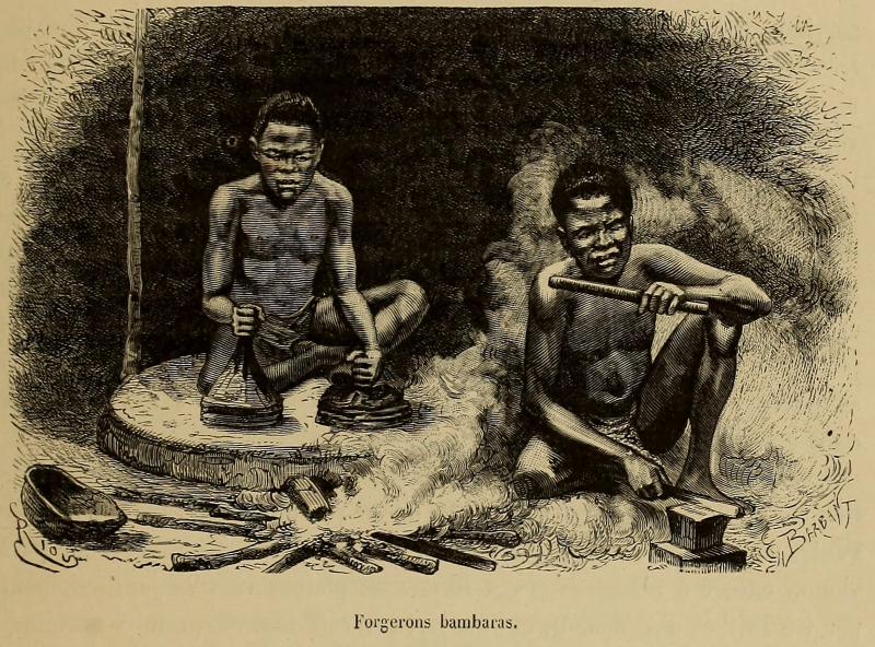 At Koukouroni, I noticed a Malinke blacksmith. His instruments were very simple; he used, as a hammer, a heavy iron mass and a small anvil placed on the ground. The bellows, crude, consisted of two leather tubes through which the assistant blacksmith presses the air through clay orifices. It is with these rudimentary means that the blacksmiths of the country make the irons of picks and axes that we see in the hands of the natives.