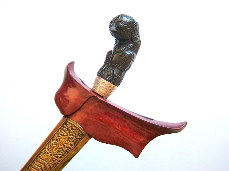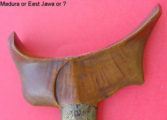 The wrongko is as well somewhat unusual for Madura, the lata is straight by the example in question, by the examples shown from me not. The hole in the pangulu handle isn't unusual, see the pics of one of my pangulu hilts. Regards, Detlef |