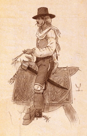 A vaquero with espada ancha worn on saddle as seen c. 1820s(first image). By 1850s, these had become shorter and more like Bowie knives so worn on the person. By later in the century saddle swords were still more the standard, so indeed there were cases of Mexican saddle mounted types into the Revolution period. However the Mexican 'rurales' of Diaz and many 'chinacos' into the Revolution wore swords in scabbard in the traditional manner.