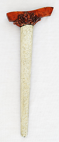 I have visited Madura a few times, and have spent a bit of time in the area of Suminep, but even when I was there, I was getting given different names for the same thing , by different people. To be absolutely honest about this naming of things, it is something that has very little interest for me. It used to have, but as time has gone by I have found that one person will swear that something is called such and such, and then an equally qualified person will come along and call it something else, or I`ll go ten miles down the road and find it has a different name, or I`ll get a firm fix on the name of something, and then ask the same highly respected source ten years later what the same thing is called, and get a different name. I call this whole thing :- "the name game", and I feel that the only way in which it should be played is by giving the name, along with the source, the geographic location it was obtained, and the date. With Madura dress, some of the motifs can be identified with either Suminep or Pamekesan. I have seen two styles of highly carved wrongkos in the Suminep Kraton museum that were identified as "gabilan", and "brahmana rsi". I have heard stories about the origin of some motifs and some wrongko styles. But I cannot give names for the wrongko styles, nor the handle styles, that I could present a case in court for, and win. |