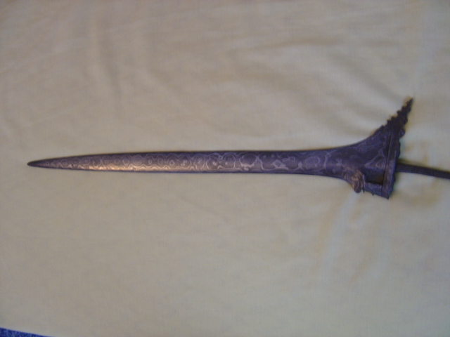 i realy enjoyed doing this ...ill post more pics when i get the gold back on it.BSMStar thanks for the cool info very helpful ...now ill have to buy another old trade blade to have a play with Hi Nachesh "i'm not so sure i see how what has been done to this blade is somehow an "improvement" over the "actual processes of the original culture" I see where you are comeing from here ..do you know what the traditional methods would have been?id love to know and i was hopeing someone with the knowhow would post and share the knowledge.I cant realy see how my methods could be that diffrent ...for sandpaper they would have just used a similar grade of stone and they presumably would have used arsenic and acid to etch it? "Smashy had some good results messing around with a few alternative methods when staining this blade, but i am not so sure the use of these harsher acids pays all that much respect to the spirit of the blade or the culture."I tried to be as respectful as i could believe me[ i put alot of time into makeing the staining process as traditional as i could] ....and i was perfectly aware that i could have just sanded the blade in five min,s useing a sanding pad on a angle grinder and then polished it useing a metal polishing wheel.But i chose to spend a day and a half sanding it by hand with 6 grades of sandpaper to near mirror polish[not an easy task i can tell you my hands were killing me at the end ].The only acid i used was sulfuric acid from a battery ..and i only wiped the blade a few times with a rag soaked in it....this is quite a mild acid[i never even wore gloves] ![]() I am confident this method will work for any keris blade ive stained 2 other blades 1 before and 1 after and both responded equally well, it just a matter of how long you leave the blade in the solution[the longer you leave it the darker it becomes].Its not rocket science if you ask me the real secret to a good looking blade is how well it was forged originaly[if the beauty is there then the etch and stain will bring it out]
