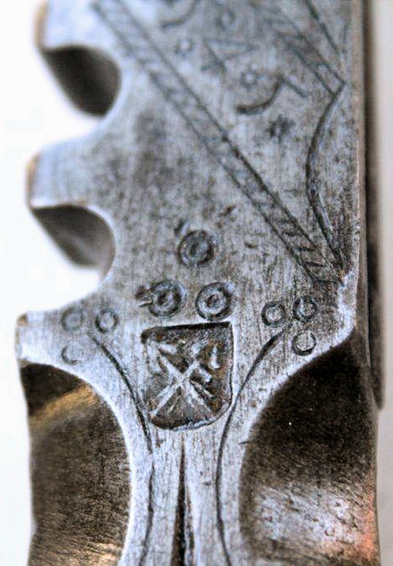It is preserved complete save the missing belt hook. It is in my friend's fine collection which you have come to know quite well by now. The surfaces of both the ratched bar and the gear box are engraved, chiseled, carved and pierced profusely, exhausting almost the full range of characteristic Late Gothic and Early Renaissance ornaments: foliage terminating in punched Late-Gothic pediculated trefoils and cinquefoils (gestielte Drei- und Fünfpässe), zoomorphic details like a stylized serpent on the ratched bar, and the basis of one of the gear box rivets carved like an animal's head with punched eyes, Gothic tracery, roped friezes (Schnürlbänder) etc. The underside of the ratched bar is engraved with a stylized hand beneath the claw; this is a characteristcally magic medieval symbol to fend off evil, a so called apotropaion. This makes it the only cranequin I have seen to feature any decoration on the underside! Its upper side is struck in front of the claw with a maker's mark, two crossed arrows, which is well known as that of an obviously rather prolific Nuremberg workshop which seemingly mostly manufactured cranequins many of which are dated. Dated specimens of their cranequins recorded by the author range from 1532 to 1545 though the earliest cranequins bearing this mark seem to reach back as far as the 1520's. The earliest recorded dated cranequin bearing the crossed arrows mark, 1532, used to be in the author's collection and has been in that of my friend since (see post #4). He also possesses another undated sample, and one dated 1540, all by this very same workshop (see posts #4 and #7). In the late 1530's, this workshop which, as the symbol chosen for their mark denotes, was originally specialized in accouterments for crossbows and bows, seems to have tried and explore the field of firearms; two fine matchlock arquebuses have survived, the barrels struck twice with the crossed arrows mark and both dated 1539 (Germanisches Nationalmuseum Nürnberg, inv.no. 494, and author's collection). For both guns see http://www.vikingsword.com/vb/showt...=harquebus+1539 Returning to the surface decoration, we note remains of gilding in the chiseled ornaments, in the mark and the pierced tracery, together with remains of bluing in the latter. This leads to the conclusion that the complete surface of the cranequin was originally blued, with the gilt ornamentation resulting in a fine contrast - imagine the colorful impact it must have achieved almost 400 years ago! My friend has undertaken the toil to dismantle the piece, providing singular insight in the technical 'inner life' of a cranequin, including the gearwheel. There are considerable remains of oil and grease preserved that are hundreds of years old and interestingly have adopted a greenish color, due to the amount of verdigris caused by the copper soldering the single iron parts were connected by. As is the case with most cranequins by that 'workshop of the crossed arrows', the gear case is not screwed or pinned but riveted; this is why it cannot be dismantled completely, otherwise we would have taken the gearwheel out. Anyway, enjoy studying this singular masterpiece of arts and crafts: 'high tech' anno 1545! Best, Michael Last edited by Matchlock; 8th June 2012 at 10:17 PM. |