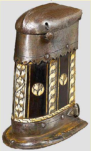 The iron frame was mostly blued, on the Brunswick and some Nuremberg patrons it was finely embossed, and on some highly decorated patrons it was etched and the outer side of the wooden core was sometimes inlaid with engraved bone plaques. They matched the guns in style that they were used along with.