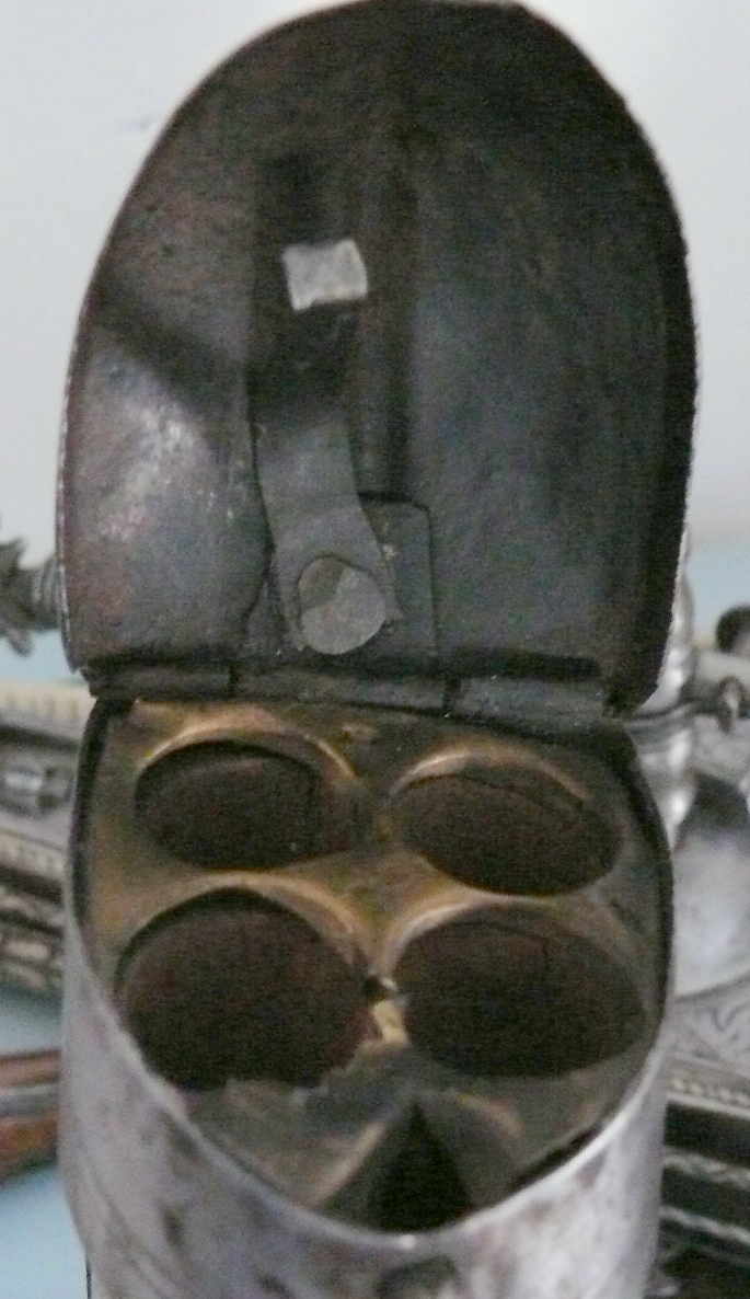 I am absolutely sure that your fine patron was made either in Ausburg or Nuremberg. The style of the bone inlay corresponds exactly to that on the wheel-lock puffers and guns characteristic of the late 1570's and 1580's. The iron parts were originally blued, with some of the bluing retained on the inside of the lid of your cartridge box.