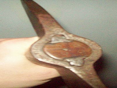 The top of the eye where the haft passes through the head has an odd cross pattern with 4 small circles on it evident in one of the pics (6th pic) . Does anyone know what this represents? Is it from the wood lathe? A design?