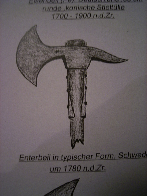i think the left one from the three hanging axes ist a common german fire axe. There are quite often here in germany on internet auctions. But in fact a very interesting topic. I looked in several books of mine and find less than 5 pictures of boarding axes. If anyone is interested i will scan them and post it, when my scanner will work again. regards Dirk |