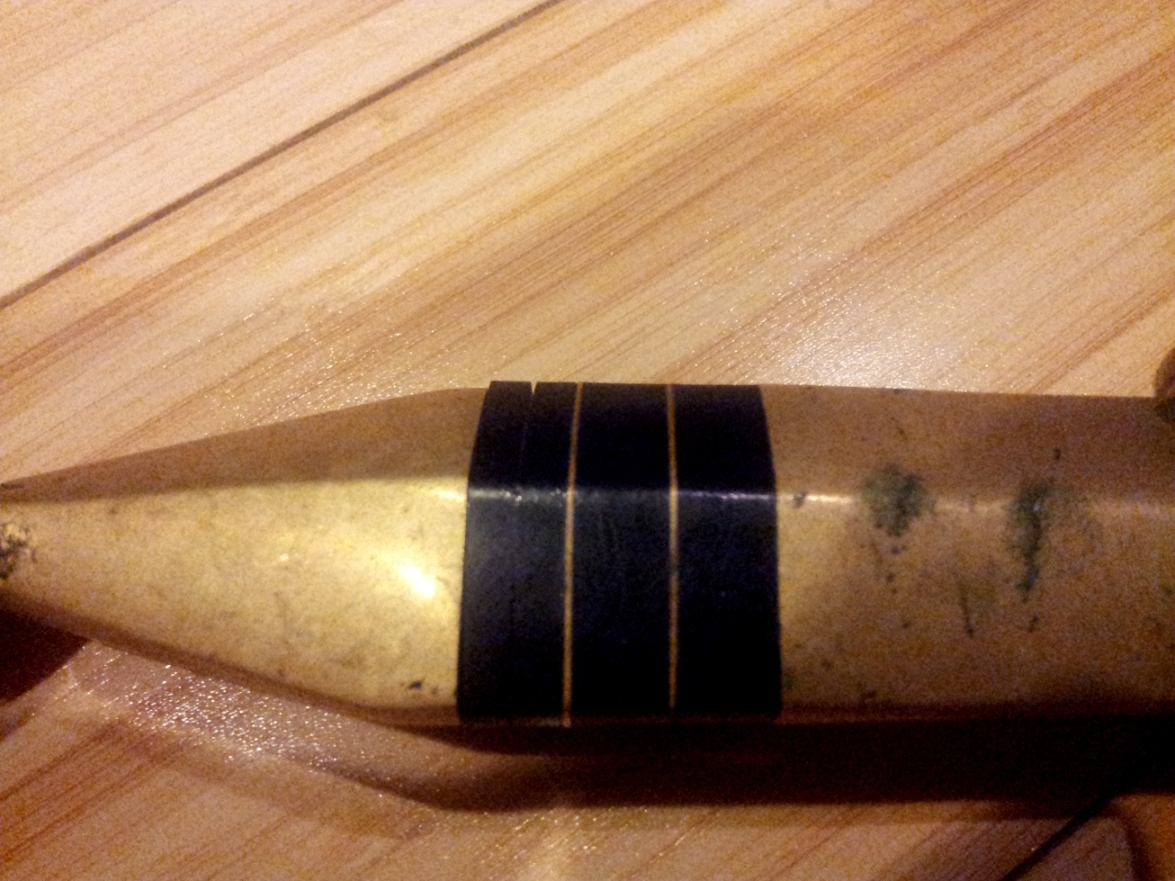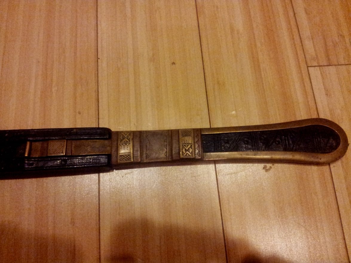 This is my first post on this forum, but I've been a periodic lurker here for quite some time. I have in my collection a little dagger that just recently came to my attention. It has been in my possession for about 5 years, and I had no idea that it was authentic. I got it out of a storage unit auction, which was for a unit that had not been visited by its owner for 10+ years, so I knew that it was at least "somewhat" old. My first impression of it was that it had been made by an amateur, since the tooling of the leatherwork and engraving was a bit haphazard. I just recently found a remarkably similar dagger on an auction site and realized that it was a Tuareg Telek, or at least in the same style as one. The curious parts of this dagger, in my opinion are: 1. The ornate (but somewhat sloppy) embellishments on the scabbard. Other similar examples seem far more plain. This even has a section of engraved silver on the handle. 2. The length of the dagger is unusual. From my understanding, telek are meant to be strapped to the forearm, but this "dagger" is about 2 ft long! 3. The Section of the handle that appears to be fashioned like a Billao handle, using strips of bone/resin/horn spaced with flat bronze spacers. I haven't seen this on any non-Somali weapons. And since the Tuareg are rather far away from Somalia, it seems unlikely for this kind of technique to be used in Tuareg daggers. I wanted to see if anyone else found this weapon interesting, and if anyone had an explanation for the strange traits that it has. It seems to not quite fit the Telek label, and I wonder if anyone else knows what this could be. If anyone has any input I'd love to hear it. The dagger also appears to have been used in combat, or was seriously mistreated. There are numerous nicks in the blade, as if it were used to parry blows. I would have thought this would be a stabbing weapon if used in reality, which is why one of my earlier theories was that it had been used as a stage prop. My current guess is that it is 25-50 years old since it looks most like other daggers I have found from that period. Telek older than 100 years don't appear to share the particular scabbard style that is exhibited. I suspect it is possibly towards the older end of that estimate, because the scabbard is lined with undyed felt, instead of a synthetic fiber. For something sitting at the back of my collection for a long time, I have been very pleased about it's new found authenticity. |