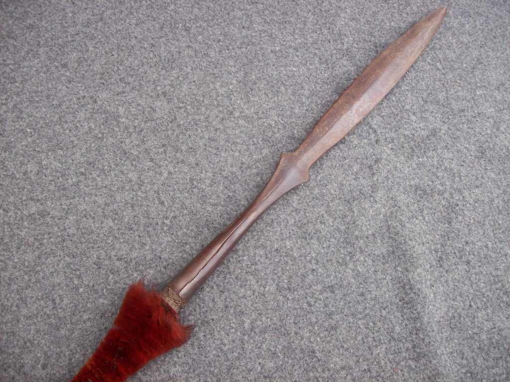 THE DESIGN ON THE BLADE OF THE CURVED KNIFE DOSEN'T LOOK NAGA TO ME OTHER THAN THAT I CAN'T SAY, PERHAPS SOMEONE WILL RECOGNIZE IT. THE CARVED FACE ON THE DAO HANDLE IS SOMETHING I HAVE NOT SEEN ON NAGA ITEMS BEFORE BUT IS A DECORATION CONSISTANT WITH HEADHUNTING SOCIETYS (I LIKE IT). WE CAN ONLY GUESS IF IT WAS CARVED AND PERSONALIZED BY THE OWNER OR ADDED TO MAKE THE ITEM EASIER TO SELL. THE HEAD EITHER REPRESENTS A ANCESTOR OR A FRESHLY TAKEN HEAD. IF IT WERE A SKULL THE EYES WOULD NO DOUBT BE ROUND. HEADS OFTEN ARE REPRESENTED IN THE ART OF TRIBES THAT PRACTICED HEADHUNTING BUT THE DESIGN WAS NO DOUBT RESTRICTED BY TRIBAL TRADITIONS AND TABOOS AS TO WHERE AND WHEN IT COULD BE USED. IN MORE RECENT TIMES THE TRIBAL LIFE AND ITS TABOOS AND TRADITIONS HAVE NO DOUBT CHANGED ESPECIALLY NOW THAT HEADHUNTING IS NO LONGER PRACTICED. I HAVE OFTEN WONDERED ABOUT THE FANCY HAIRY NAGA SPEARS. THE HAIR NEAR THE POINT WOULD SERVE TO KEEP BLOOD FROM MAKING THE ENTIRE SHAFT SLICK. THE OTHER SECTION LIMITS THE GRIP AND MAKES IT SUITABLE FOR A SHORT THRUSTING SPEAR FUNCTIONING LIKE THE ZULU SPEAR. SLIDEING TECKNIQUES AS USED IN CHINESE AND OTHER SPEAR FIGHTING TECKNIQUES WOULD BE ELIMINATED. THE HAIR WOULD ALSO MAKE IT A VERY POOR THROWING SPEAR. PERHAPS THERE ARE FILMS OF THE NAGA STYLE OF SPEAR FIGHTING TECKNIQUES.? THE SHORT SPEAR WITH THE BAMBOO HANDLE AND THE SPEAR WITH ONLY HAIR NEAR THE BLADE AND THE STEEL BUTT SPIKE COULD BE USED MORE FREELY. THE USE, TRIM AND COLORS OF THE HAIR DOES MAKE THE NAGA SPEAR ONE OF THE MOST BEAUTIFUL OF SPEARS.