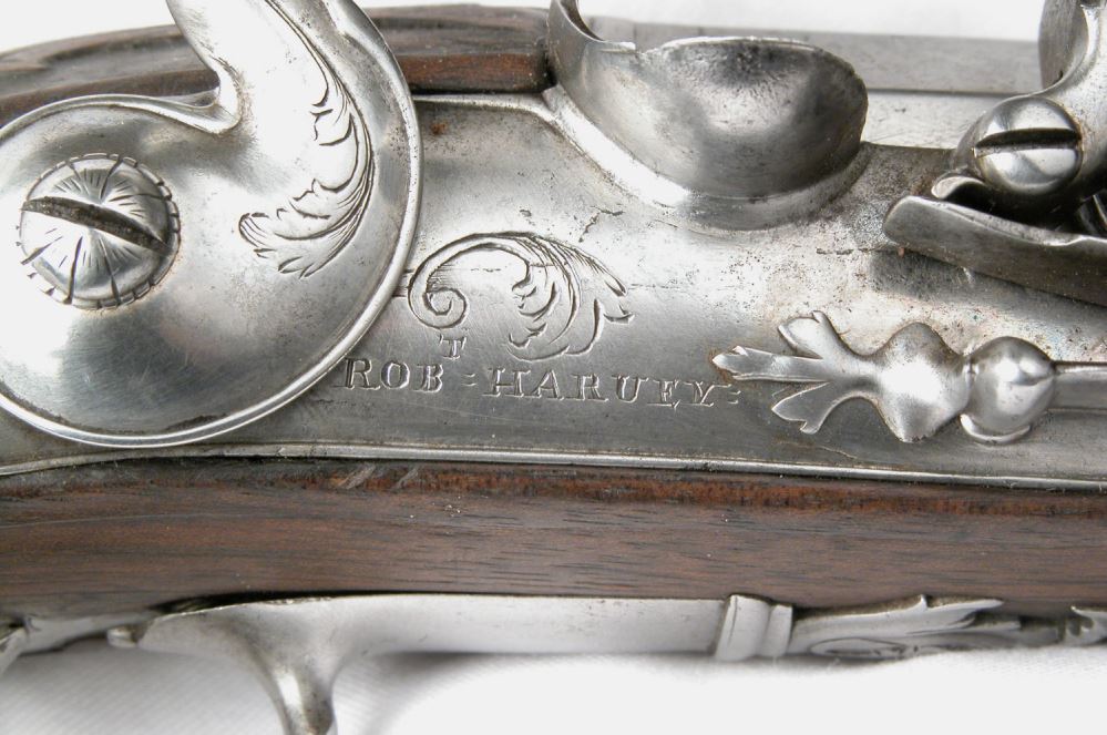 Hi everybody, I recently bought a fine pair of flintlock pistols which, judging by the engraved crest on the escutcheons, originally belonged to an Earl of Lauderdale. The silver hallmark date 1721 fits the dates of the 6th Earl. The lock plate is engraved with the name 'HARVEY' on a scroll (image 3) but the barrel is stamped with the mark, PG (image 4), of another contemporary gunsmith, Pierre Gandon. However, this is not the mystery since gunsmiths frequently used barrels from other makers, often foreign ones. I initially thought that Harvey was Robert Harvey, a noted gunsmith from the early 18th century (died 1734) but on digging deeper into Robert Harvey, all the examples which I could find (12 so far) were signed ROBT HARUEY (sic) in a straight line, not on a scroll (images 7&8). So, is my Harvey a different person, or the same Harvey who has dramatically changed his style of signature? There was a Richard Harvey, a brother very likely of Robert, apprenticed to the same master, but he disappears from the record in 1709. It's possible.Further confusion arose when I found that Pierre Gandon, a Huguenot immigrant to London, had signed at least two pistols on a scroll in the same manner as my Harvey signature; the style of butt caps was also very similar to those on my pistols. Did Gandon fancy forging a Harvey signature, just different enough to avoid prosecution but close enough to fool some people into buying his work while believing they were buying pistols by Robert Harvey? The pierced silver side plates do not help as they are a standard casting to be seen on other pistols by other gunsmiths.