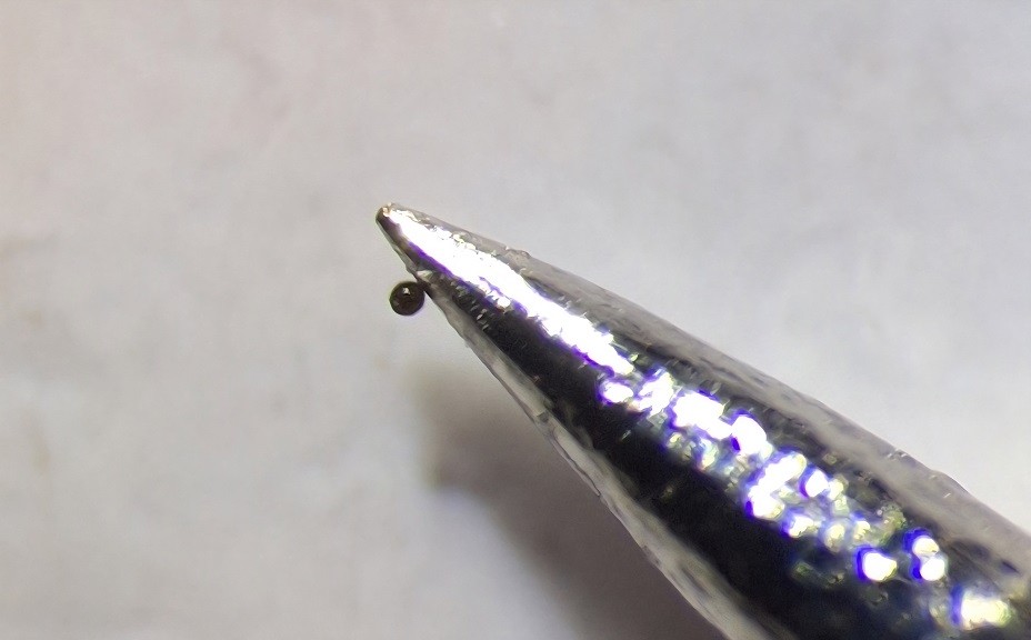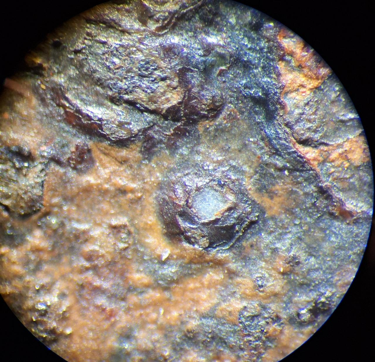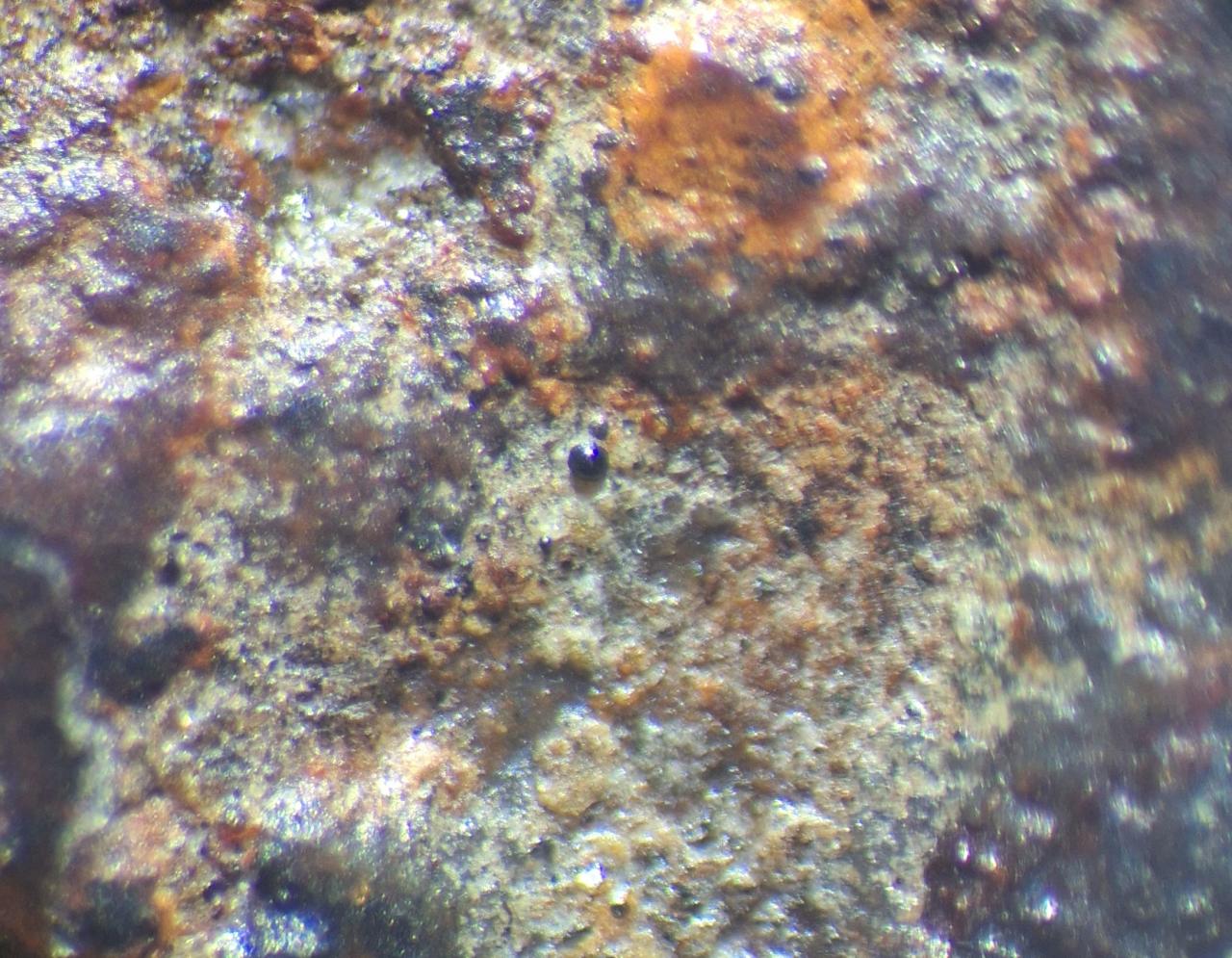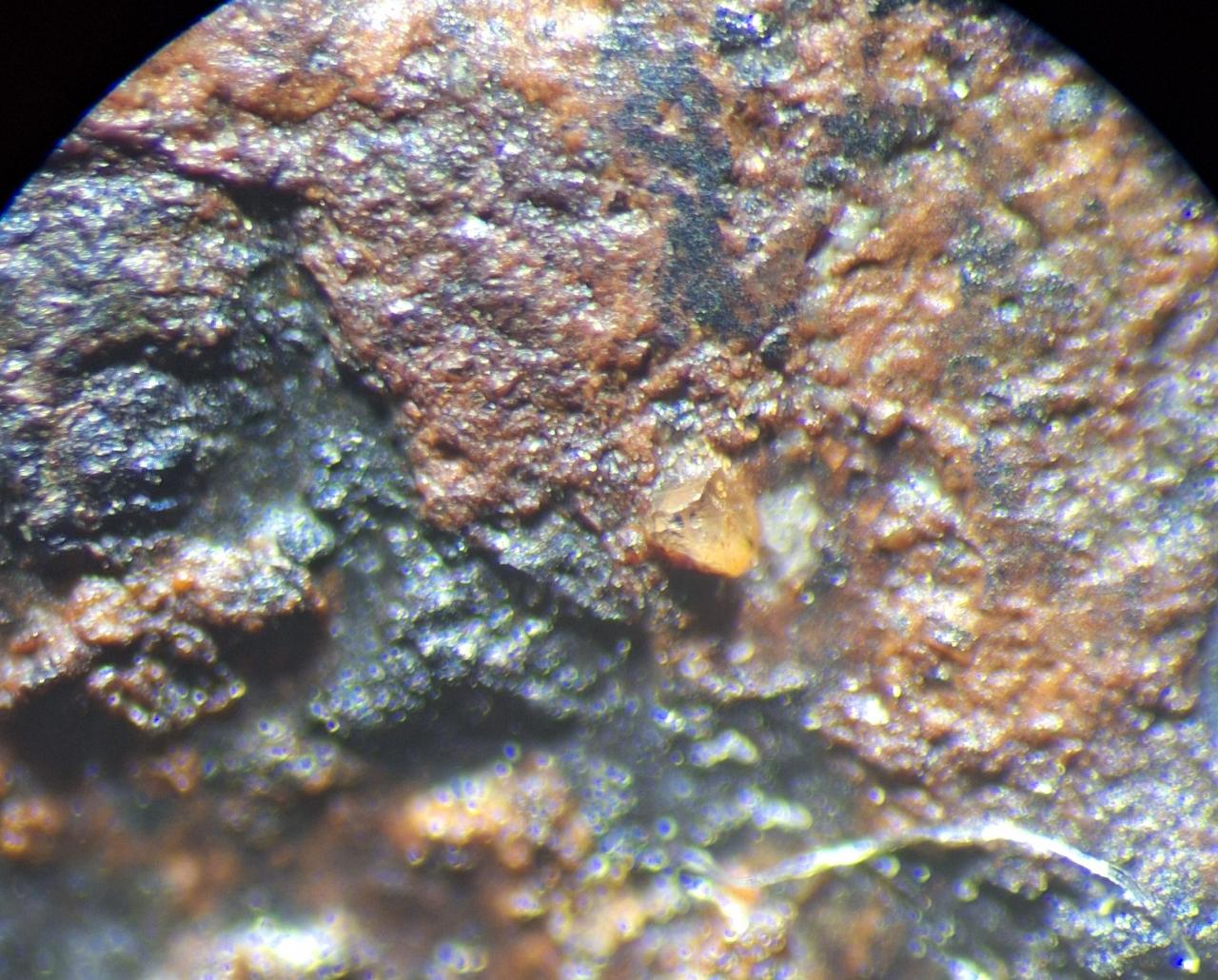 Occasionally, microscopic black, glass-like beads could be identified. They are located in rust craters and are not magnetic. These are most likely molten slag inclusions that have been exposed by the corrosion of the surrounding material.