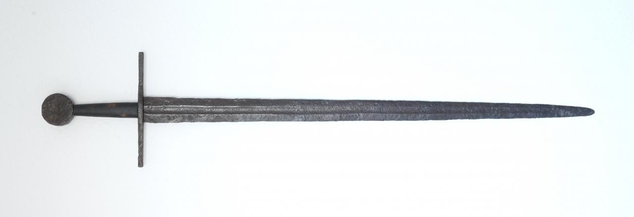 Two XRF analyses were performed, including on the surface exposed by the cut. The steel of the blade has a manganese content of ~0.8-1%. Similarly high manganese contents can be found in early medieval swords, among others (cf. publications by Lehmann, Williams, etc.). Modern trace elements such as Cu and Ni are absent. Manganese improves the properties of the steel, but was not added intentionally at the time; rather, it was present in manganese-rich ores. Interestingly, manganese was also detected in the crossguard, but not in the pommel.