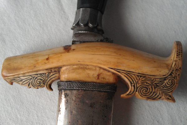 a beautiful sikin panjang with a so called 'peusangan' hilt. The brass lobes are also very nice. Wonderful complete piece, in perfect condition considering its age. A very nice 19thC sikin. These kind of hilts (hulu), with the 'broader' beaks, are called hulu 'peusangan'. 'Peusangan' is a district, located around the 'Peusangan' river in the northern part of Aceh. Probably these kind of sikin panjangs 'peusangan' are from that region, and differ with the 'normal style' of sikin panjangs with their broad beaked hilts, and the crosspiece on top of the scabbardmouths (made from different materials, such as wood, horn or, like yours, from ivory). I've added two drawings with sikin panjang Peusangan. One is from the Fischer catalogue, and the other one is from Kreemer. Last edited by Maurice; 1st November 2024 at 09:22 PM. Reason: addition |