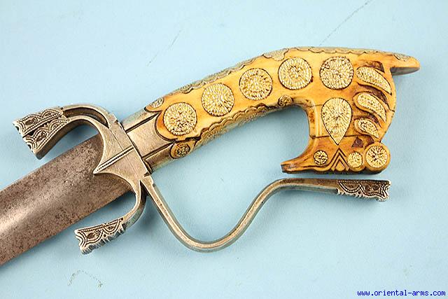 The Zanzibari Nimcha with Nimcha hilt and blade which are almost identical though blade tips are not clipped. Base ring usually not ornately decorated in enamel or arabesques . The Quillons usually ending in open mouthed Yali or serpents..The scabbard if present usually plain and often in the Omani leather style with sworls designed onto the leather.... Occasionally with a Dee Ring. Some, but not all, quillons decorated with rows of dots and back to back R shapes... and on top of the pommels a Turtle!!