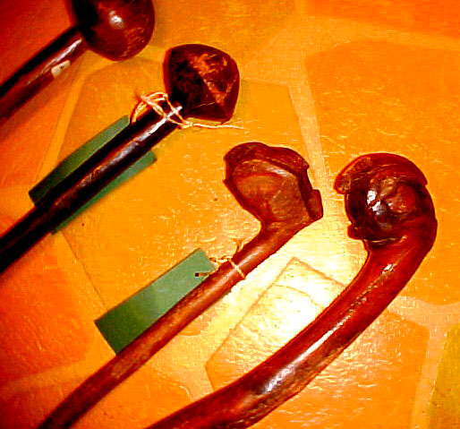 By the way, these were often used as missles/trowing sticks for hunting small game and fowl as well as for hand-to-hand combat, and some of the lighter ones may well have been made with that in mind, although they are also used in ritual combat and in coming of age rites by many tribes as well, often accompanied by small wooden shields that are almost identical to the Australian aboriginal types that most are familiar with. Of the four shown, (L to R) the two round headed are Zulu, called "Iwisa", while the other two are Swazi and called "Lingedla", decidedly parrot headed in shape and with a depression in the top and bottom that was kept packed with animal fat to prevent splitting when not in use. As you can see, the larger one has beem cut down slightly and I actually use it as a cane, since running is no longer an option!**grin** Surprisingly, it's been admitted to both courthouses and airports and the guards actually told what is is, only to recieve admirable comments and then be returned to me, although it's definitely lethal, far moreso than a baseball bat that was often favored by gangster elements.....apparently, it has to be steel before they realize it's deadly!