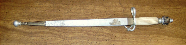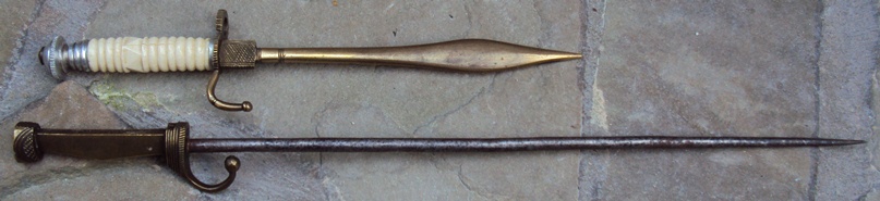 I don't know what this piece is, I see some similarity in this post, the metal mounts are aluminum, the guard in the shape of a Lebel bayonet. The pumpkin shape ball pommel is horn and much eaten by insects. Grip is reeded bone. 17" overall. Any idea?