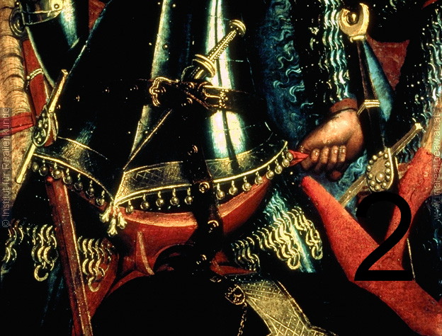The second dagger has a roof-shaped blade, the front side with a midrib and a copper inlaid mark. The back side is quite flat. The pommel-cap and the guard are strongly curved towards the blade. The guard has elevated and reinforced tips of the usual form. The tang is riveted over the pommel-cap with a tall tang button. It dates to the 14th century.