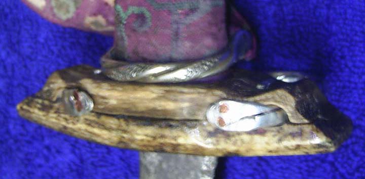 The bottom half is made of seacow bone sent to me from the previous owner (and I colored to better match the rest of the whalebone). Had to use silver pins since the whalebone was too porous for glue. The looped guard is silver in the form of 2 naga/snakes and the heads coming out of the other side facing each other with copper eyes (did my best on the heads ). Here are the pictures as promised.