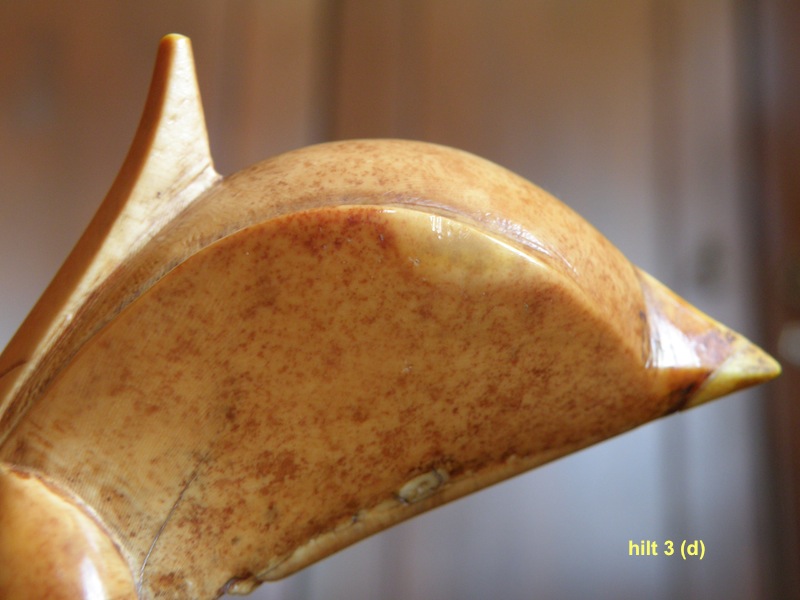 And here the picture from the dugong ivory hilt. Carved from a tusk those who can reach a length from 20 until 25 cm. The ivory look similar like elephant ivory but have a concentric structure and by this you can recognize dugong ivory.