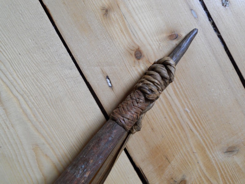 BOW 3 'natural' branch hardwood stave with only minimal working , 145 cm long, 3cm wide max, plaited leather 'string' , grip covered with leopard skin.
