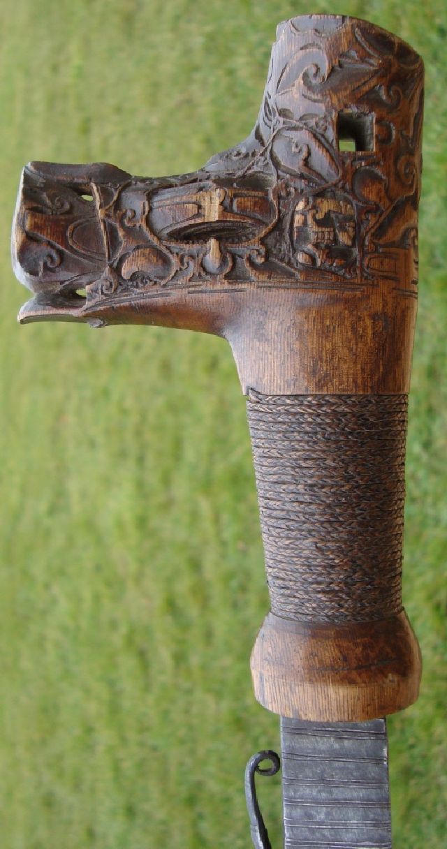 Wooden hilts are among collectors less valued that antler however they are interesting as the carved is more free to carve what he wants.