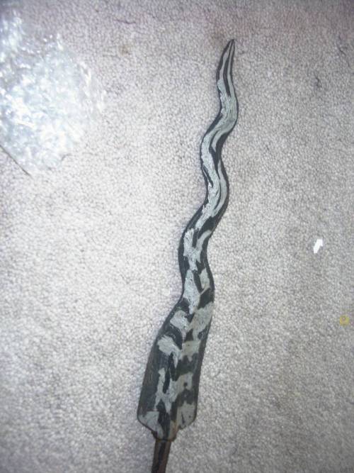There are basically five types of handle, any one of which might be correct. In original intent this is either a mata tombak (militia spear) or a lembing (pike; used primarily by professional soldiers). The lembing handle is long: over ten feet, as up to almost 20, tapered, with a thick, heavy butt. The militia spear handle is around 5 or 5 1/2 feet in my experience, though there is frequent talk of 7 or 8 feet. It is thickest in the middle, tapering to both ends. The modern house size handle, commonly referred to as a display handle, is shaped like a militia handle, but is much shorter; generally around 18 inches. All these will have a metal fitting at each end to contain splits. They are also traditionally hilted as daggers, with either a non"kingfisher" type k(e)ris hilt or with a symetrical dagger handle with and integral crossguard and sheath tensioner, often somewhat similar in overall outline to a khoumiya hilt, though the tensioner works as a plug, not an overlay, like the dripguard on a khoumiya. Either of these dagger styles would typically be provided with a style of sheath specific to it, while this one currently has the typical spear scabbard.