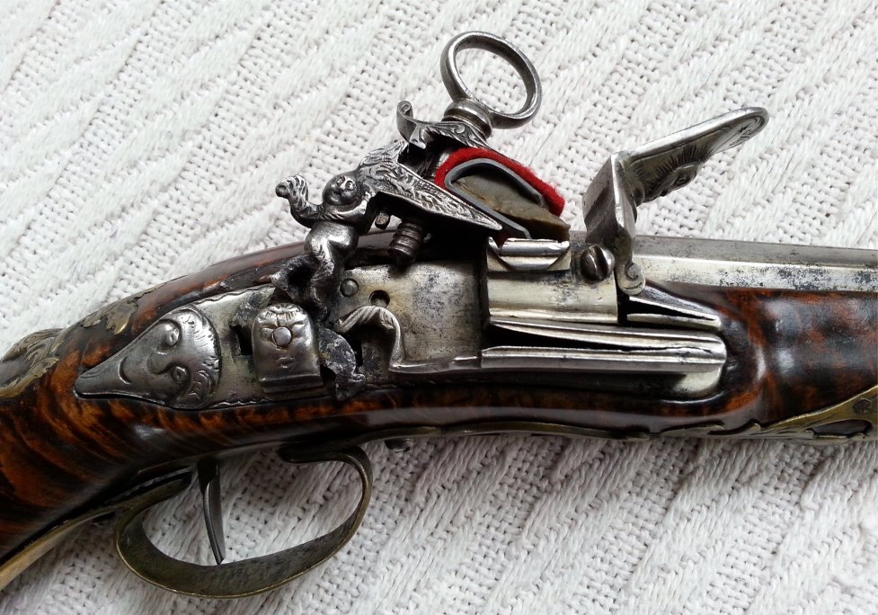 Just to make a point: chiseled work of masks in the deck (plate) and the flange (bridge) the trigger (trigger) and sun on the rake (frizeen) is mediocre if not bad. Same for the figure holding the lower jaw. The sheet of spring blades is far greater perfection.