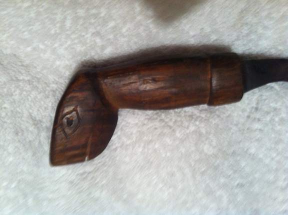 SPUNGER THE EXAMPLE YOU SHOW WITH THE INLAYED BLADE IS SIMULAR TO THE ONE I SHOW IN MY POST ABOVE WITH 12 ITEMS IT IS PICTURE #7 AND HAS AN OPENWORK CARVED SCABBARD WITH SILVER BAND AS WELL AS A INLAYED BLADE. SORRY THE PICTURE IS SO BAD BUT IT IS ALL I HAVE. I AGREE IT WAS LIKELY MADE BY THE SAME ONES MAKING THE FANCY BOLOS ON LUSON VERY LIKELY DURING THE SPANISH OCCUPATION PERIOD. THE UNBRELLA HOOK GARAB WAS MADE THAT WAY AND NOT RECARVED FROM A BROKEN HANDLE. I HAVE NO IDEA OF ITS ORIGIN OTHER THAN PHILIPPINES.