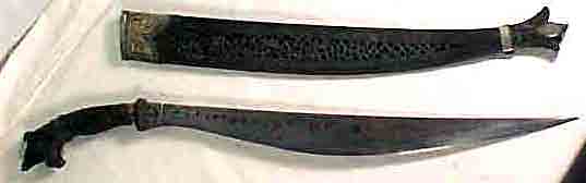 Here's a few shots of mine; I think it's more a “country” style. 22 inches long, very beefy blade, handle with some kind of animal design, blade is beveled on one side and is very sharp. It stays one quarter-inch thick until the last quarter of the blade; it's a very heavy blade. Certainly adequate to cut through heavy brush and branches, I'm sure that it would work fine as a weapon.