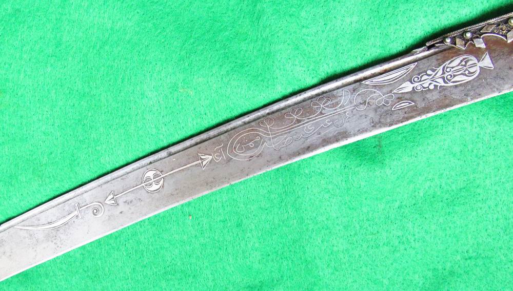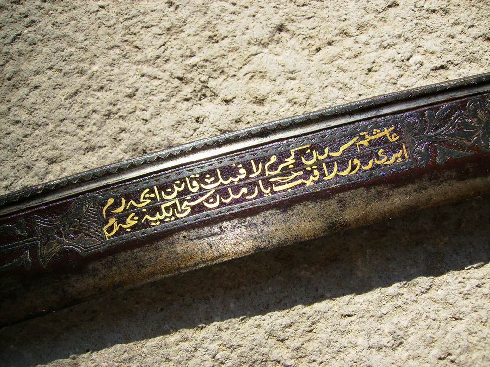Thank you very much for the translations. The yataghans in posts 55 & 56 were similar in terms of their decoration, and were made in a span of 4 years, but as we now know thanks to your translation, by different smiths. Also, thank you for cinfirming my suspicions about the inscripions on the modern Indian daggers: it must indeed be difficult for contemporary kotgari artists to copy old inscriptions.