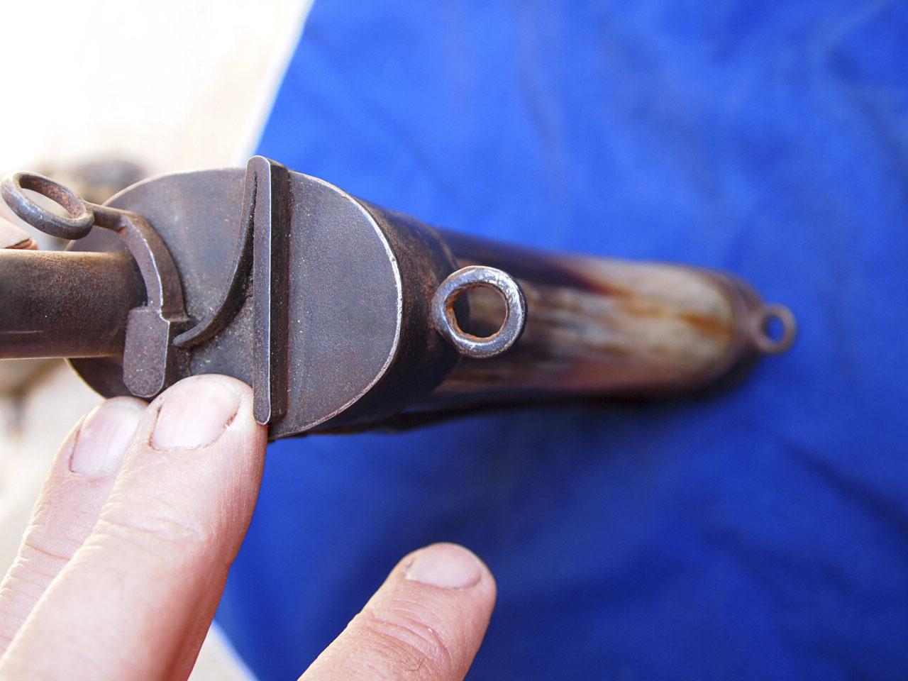 In the case of Tony's flask, which may not have been made in Germany or Northern Europe, there are two transversal screws piercing the flattened cowhorn body, their big rounded heads clearly visible one below the other. The upper screw enters the obverse of the iron base plate of the top mount, goes right through the cowhorn, on through a hole on the reverse of the base plate, and entering a threaded hole in the broadened upper end of the belt hook - thus fixing the top mount to both the cowhorn body and the belt hook. The second, lower screw does likewise, but just goes right through the horn and into another threaded hole in the belt hook, thus keeping the belt hook from pivoting.