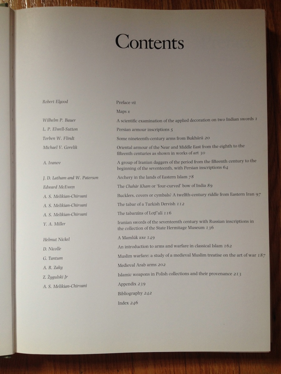 Islamic Arms and Armour, Robert Elgood, Scolar Press, London, 1979. 252 pages, 252 photos (color and black-and-white). A must-have for anyone interested in the topic. My copy was signed by Mr. Elgood at the Baltimore Show in 2004 (he made it out to me). $350.