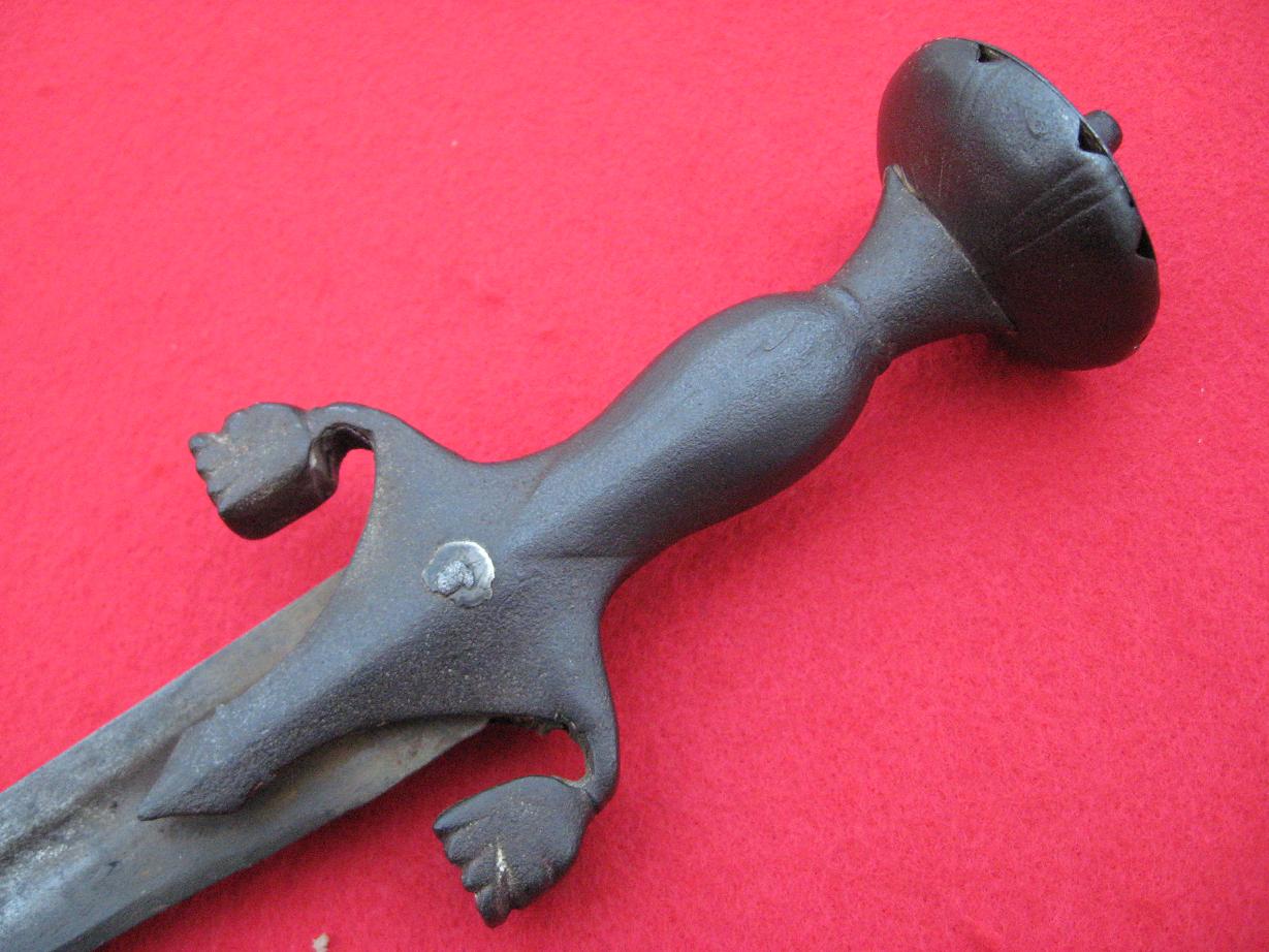 This pulwar is 33 inches long over all. Hilt is complete and undamaged with visible decorations. Blade is still very sharp with signs of excellent craftsmanship. A dark patina is present in areas, but the surface is still nice and smooth with minimal deterioration. Many different makers marks are visible on the blade. Please see the photos for details. The original scabbard is also still present with a fine leather covering and detailed metal bottom. Again please see pictures for details. Price $400.00 plus shipping world wide.