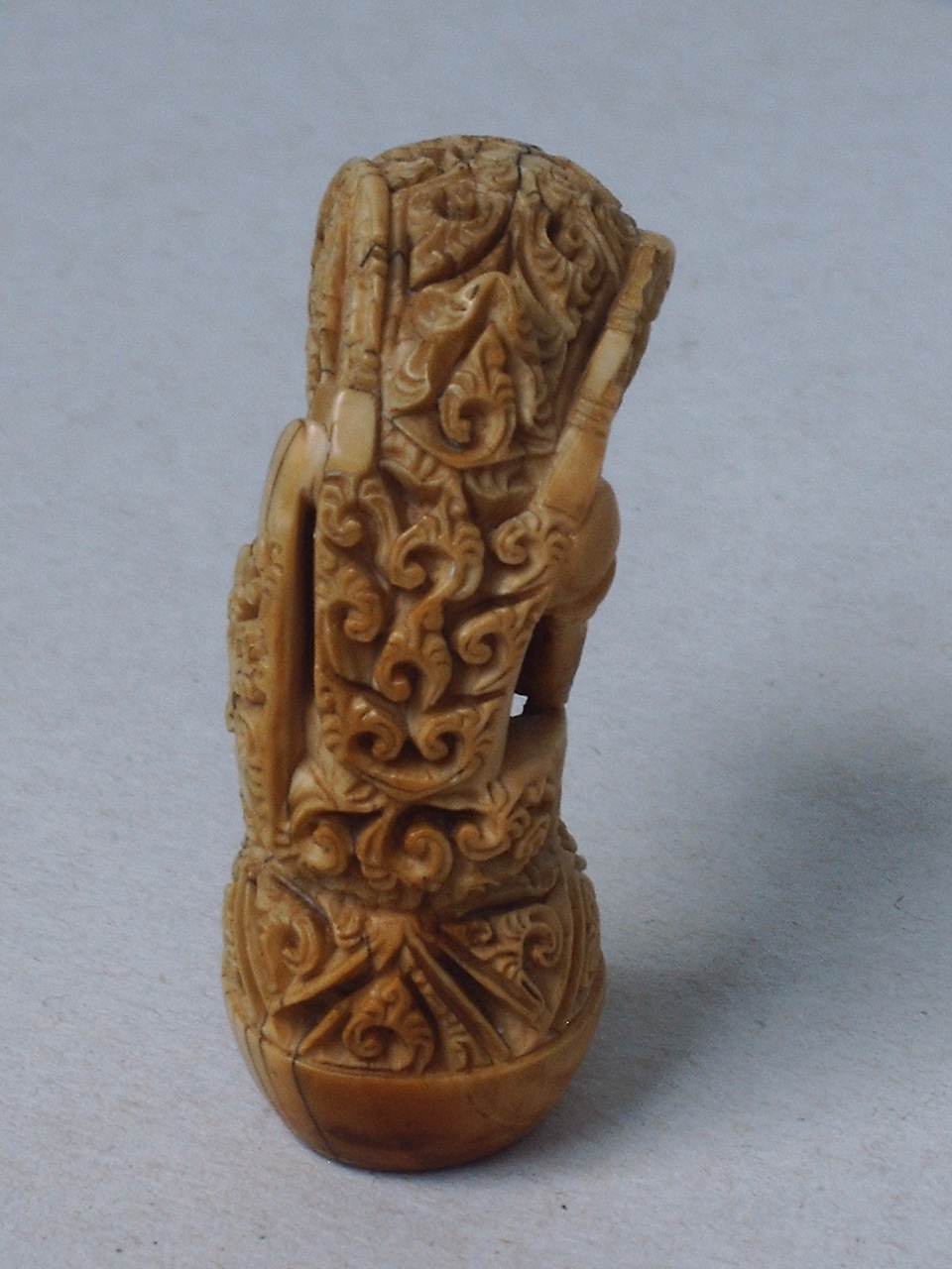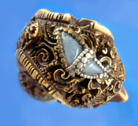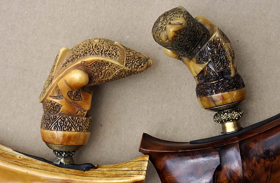 I'm late to the table here - found the topic while going through the Palembang-posts of the forum. IMO Detlef is probably spot-on: The insert has been done to cover up the natural pulp cavity of the tooth. I have a Madurese "Donoriko" hilt from sperm whale in my collection, with the tooth mounted upside down, so that the cavity is sutuated right at the crown of the hilt. To accomodate this, a seperate piece has been carved with okir and set into the cavity with small ivory pins. I think this was done, because keris hilts typically are wider at the top and the tooth of course wider at the base. Detlef, I would say that your's is probably carved from hippopotamus tusk: The pulp cavity in sperm whale teeth is, in my experience, "always" lenticular in shape. Your's is half-moon shaped, like that of hippo tusk and it seems in your last picture, that the TIZ continues over the figure's left ear and down his shoulder? Great pieces both of them btw!! Best wishes, - Thor |