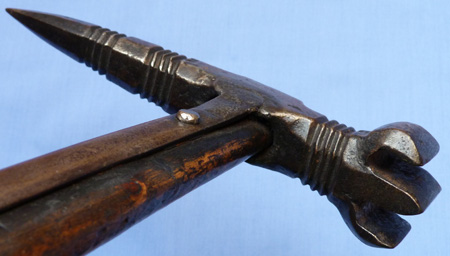 The most popular war hammer had a hammers head which was often hexagonal in cross-section and tapering to the shaft. It was usually balanced by a long slightly drooping beak.